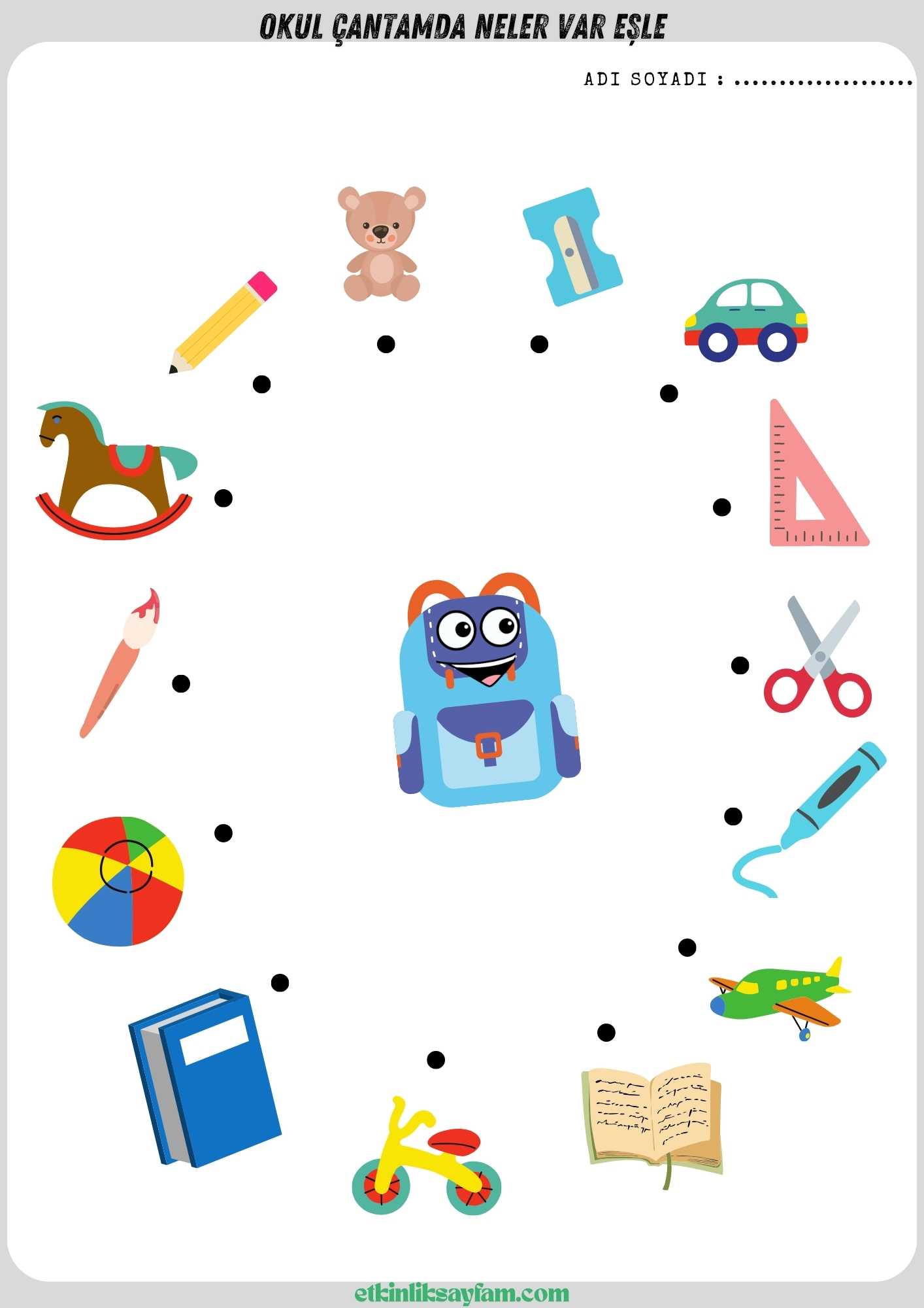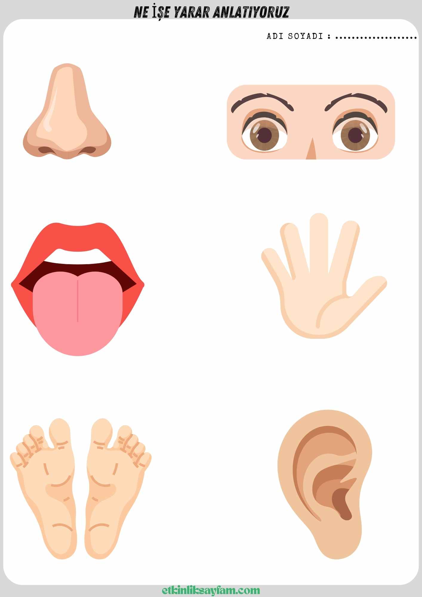 Sitede çizgi çalışmaları, boyama sayfaları, eşleştirme etkinlikleri ve kelime kartları bulunur.Tüm sayfalar PDF formatındadır.